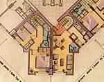 Ten-story towers are located on the site opposite to the one already described, producing spatial interest, variety and permeability. |