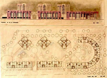 This proposal addresses some issues on urban redevelopment, exploring ways of renewing the urban tissue o a lot by lot basis, acknowledging the existing demand for land within the city, and generating design guidelines to ensure a harmonious image but giving way to individual building expression at the same time. A thorough analysis of “Habraken´s Grunsfeld Variations” was carried out during the first phase of the studio as a means to allow occupants to express their own identity, but having local circumstances and building techniques to play the own role. Shown here is the proposal for a typical lot (11 mt by 22 mt.), in which the dwelling unit is flexible enough to meet the unknown demands of its users. “Habraken’s Theory Supports” was also studied and modified in accordance with colombian satandards and ways of living. This is shown in the way the service core (kitchen, laundry area, and bathrooms) is placed, giving considerable flexibility for organization of social and private zones in the dwelling. The idea of achieving flexibility in plan is also applied to the street elevation in which order is brought about through principal and secondary axes. |